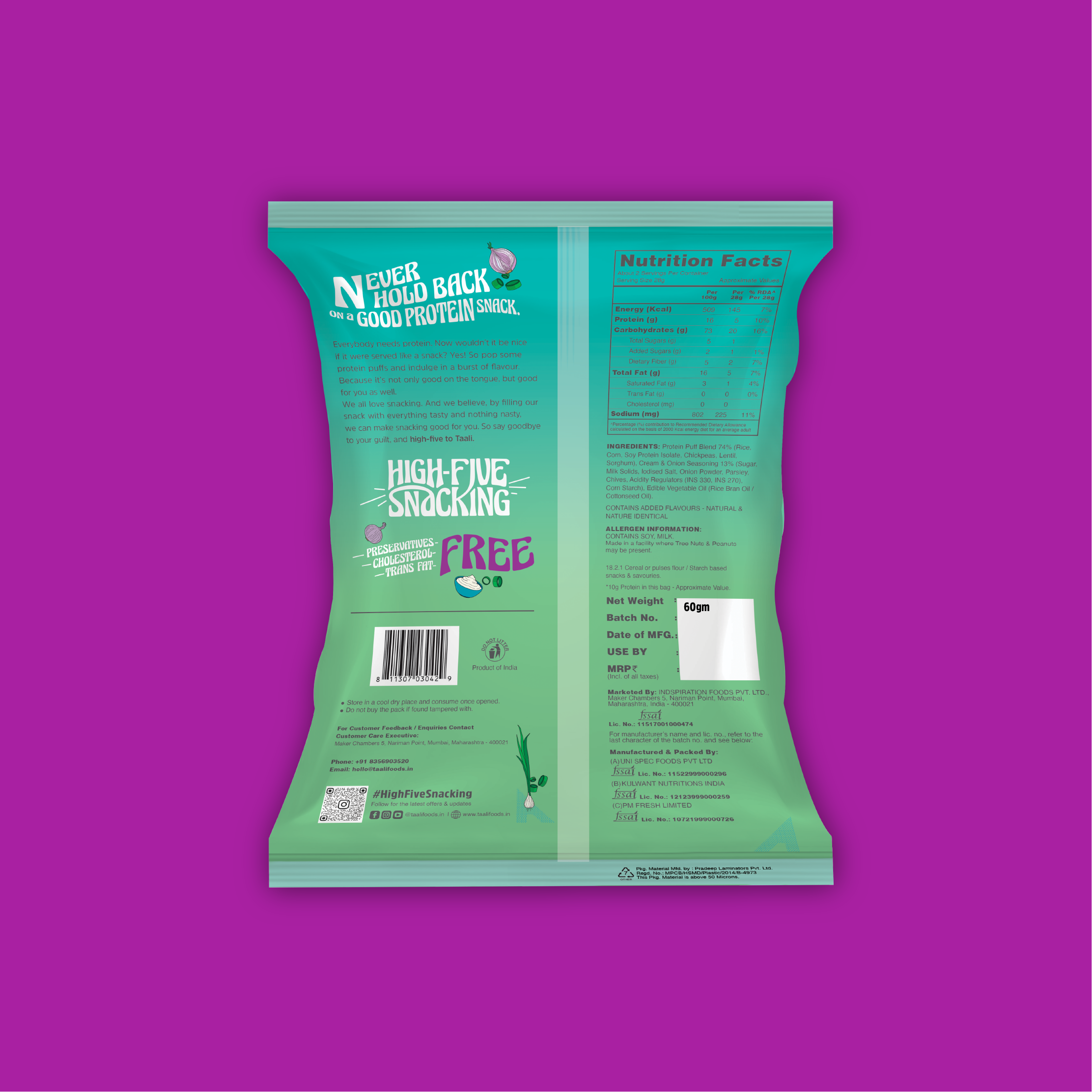 Say goodbye to empty-calorie snacks loaded with Maida and fillers. Taali Protein Puffs are completely made with natural ingredients you can trust. No corn starch overload. No trans-fat. Just clean, protein-rich snacking.
