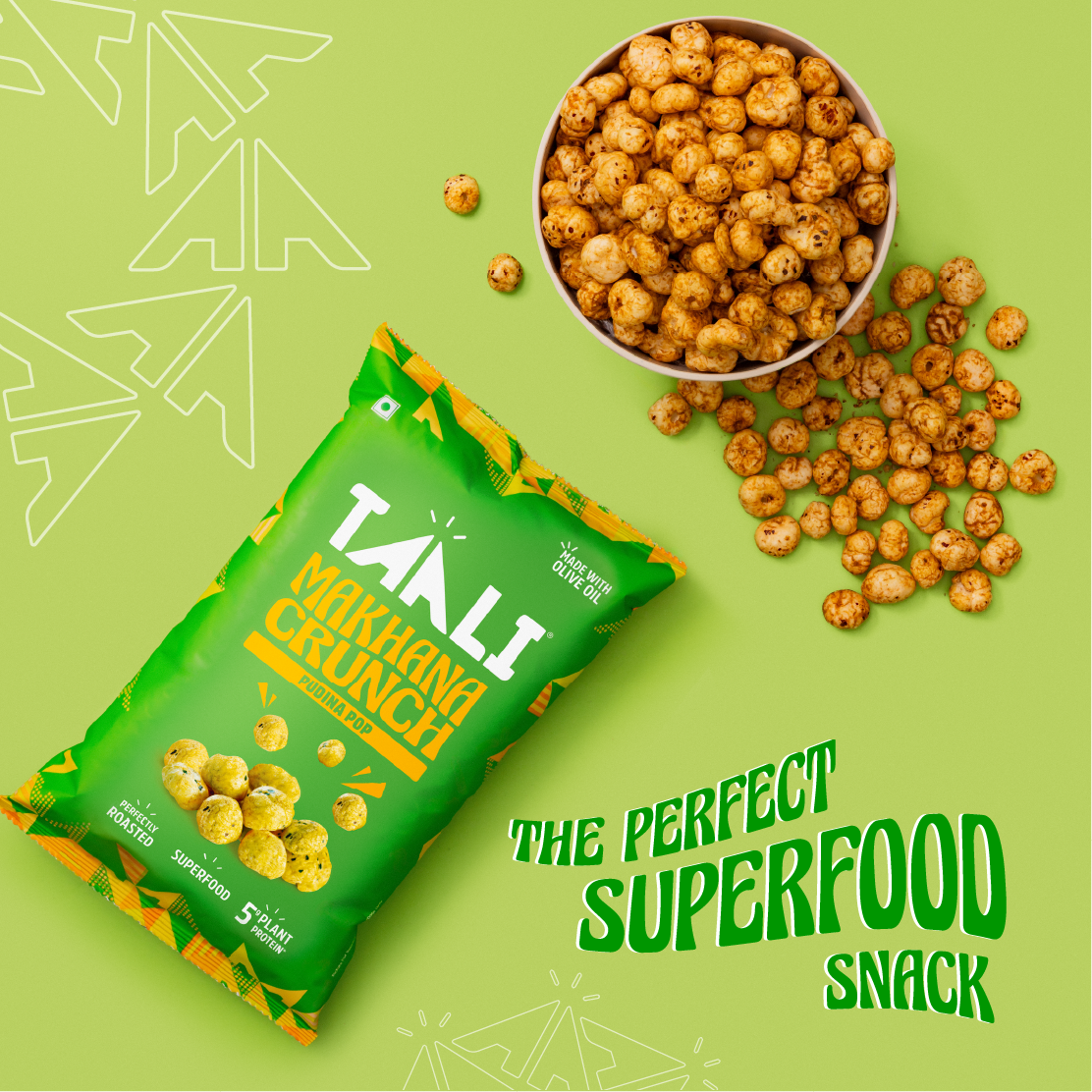 Craving something namkeen and tasty? Try this delicious Taali snack for the perfect savory fix. Our Pudina Pop Makhana (Water lily Pops) brings together a bold blend of mint masala and earthy spices, creating a unique, lip-smacking taste in every bite. Roasted—not fried—for that signature Taali crunch, it’s a cool-meets-zingy explosion you’ll keep popping!