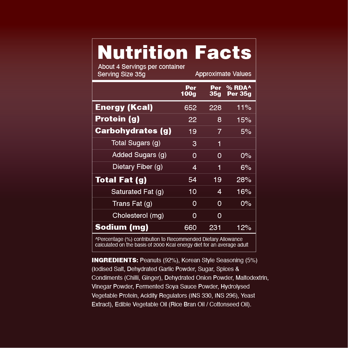 We use premium Bharuchi peanuts, carefully roasted to achieve a golden crunch without frying. Every bite is full of authentic Korean-inspired spices that deliver a crispy, satisfying texture – no grease, no guilt.